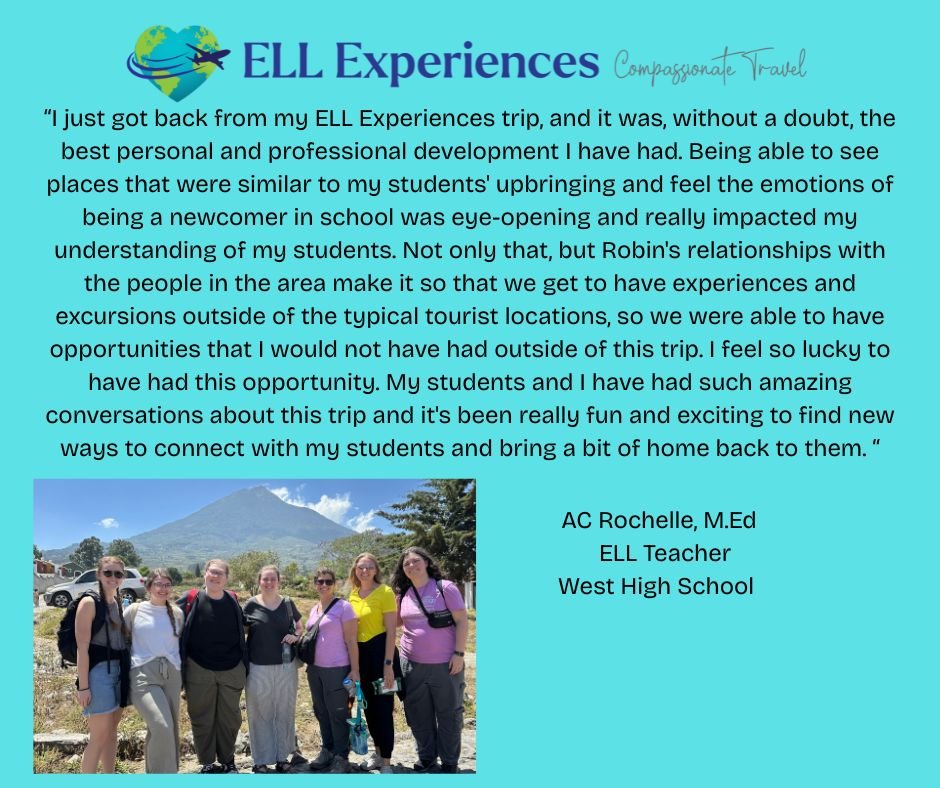 “I went on this trip in June 2024. I have taught English Learners for the past 12 years in an elementary school in TN. I lived overseas for 5 years out of college moving to a place I didn’t know the language. That was an experience for me that shaped a lot of the way I interact with students. However, this trip in June was very powerful for me as an educator. I participated in a 4th grade classroom as a student. My teacher did not speak English and I realized in those days just how little Spanish I knew. I found myself depending on social cues and other students (who also did not speak a lot of English). My teacher really tried to engage me and include me. I felt dismissed by students sometimes because I couldn’t explain myself. I also went to Spanish class for 2 hours at the end of my school day. My brain was fried! It really was an empathy building experience.”